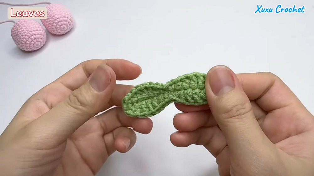 • Crochet 1 half double crochet, 3 double crochet stitches, 1 half double crochet, 1 single crochet, 1 slip stitch, 1 single crochet, 1 half double crochet, 3 double crochet stitches, and 1 half double crochet.