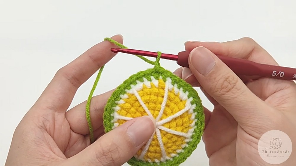 - Use a yarn needle and white yarn to create small lime slice patterns on the crochet piece.