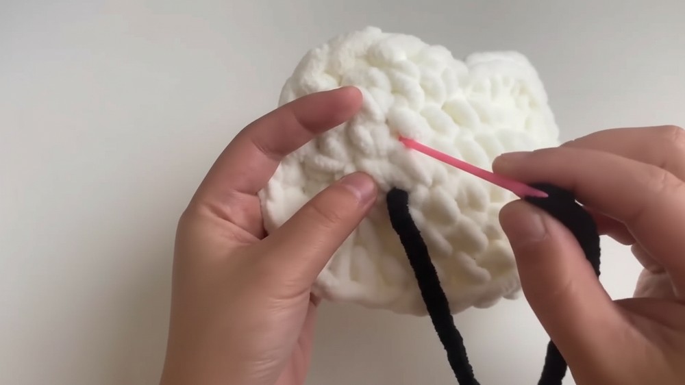 When sewing the face and ears onto the bag, use a matching black thread or thin yarn instead of the chunky velvet yarn. This makes your stitches invisible and prevents the assembly points from looking bulky!