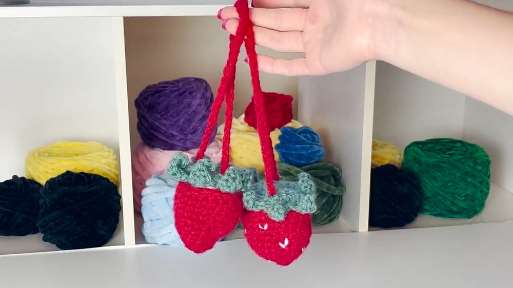 Add Strawberry Seeds: Using white yarn and a darning needle, create small V-shapes to represent seeds.