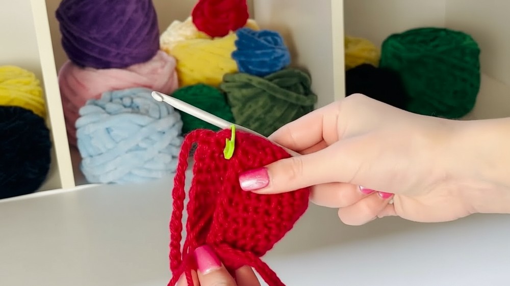 Round 2: Place a single crochet in the first loop and a stitch marker. Put another single crochet into each stitch of the row.