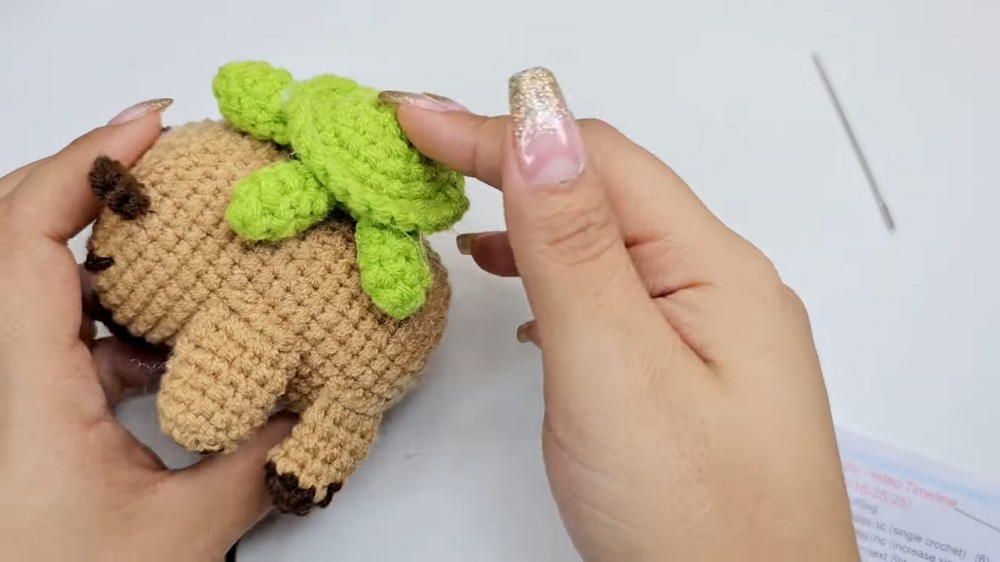 The standout feature of this project is the removable-style turtle backpack, which includes a shell, head, and four tiny legs. The capybara itself features “sad” expressive eyes and a distinctive snout that captures the real animal’s calm nature.